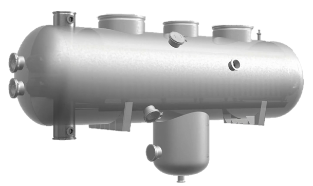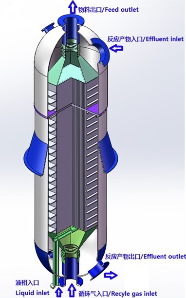 循環(huán)換熱分離器應(yīng)用于煤制油裝置費托合成單元,將來自反應(yīng)器的高溫油氣經(jīng)與循環(huán)氣換熱冷卻并分離,分離后的液相重質(zhì)油經(jīng)加熱后送至汽提塔,分離后的氣相高溫油氣進(jìn)入油氣空冷器冷卻。循環(huán)換熱分離器整合了板殼式換熱器高效傳熱與高效分離器高精度分離技術(shù),采用防堵塞專用板型,傳熱效率高、分離精度高、傳熱與分離功能二合一,節(jié)省占地與配管空間。循環(huán)換熱分離器為首創(chuàng)產(chǎn)品,依托400萬噸/年煤間接液化成套技術(shù)創(chuàng)新開發(fā)及產(chǎn)業(yè)化項目榮獲2020年度國家科學(xué)技術(shù)進(jìn)步一等獎。