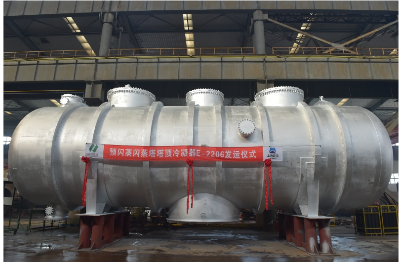 大型板殼式塔頂冷凝器采用安全回轉(zhuǎn)殼內(nèi)裝傳熱板束,選用高效不等間距板式傳熱元件;熱側(cè)氣相采用短流程寬通道,壓降小;冷源側(cè)采用窄通道長流程通道,強(qiáng)化傳熱;殼內(nèi)設(shè)置分離腔實現(xiàn)氣液相分離。大型板殼式塔頂冷凝器可集成預(yù)閃蒸塔與閃蒸塔所需冷凝器于一體,實現(xiàn)真空工況塔頂氣相大流量介質(zhì)的冷凝、冷卻。